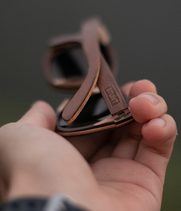 Por ello, hemos seleccionado la madera como el núcleo de nuestros lentes de sol. Este material no solo añade un toque orgánico y resistente a cada par de lentes, sino que también encarna la esencia misma de la aventura. Cada par de lentes STUNT se distingue por la singularidad de este componente, transformando tus aventuras en vivencias auténticas e inimitables.